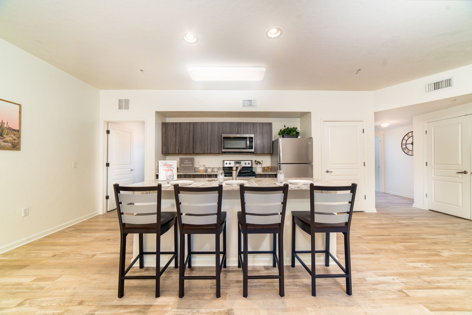 Each fully furnished, recently remodeled apartment includes not just your living room and bedroom furniture, but also 50" 4K Samsung TVs, stainless steel appliances, sleek granite countertops, an in-unit washer and dryer, and updated hard surface flooring.